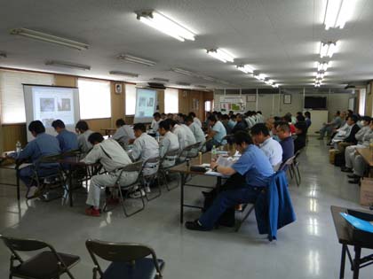 平成25年5月25日に技術講習会に参加しました。当日は天気にも恵まれ絶好の講習会日和となりました。午前中は座学にて工法使用部材の施工方法等の注意点などの講習が行われました。午後は長島鋳物葛v喜事業所試験施工ヤードにて「花丸工法」と「内径カッター」の試験施工が実施されました。